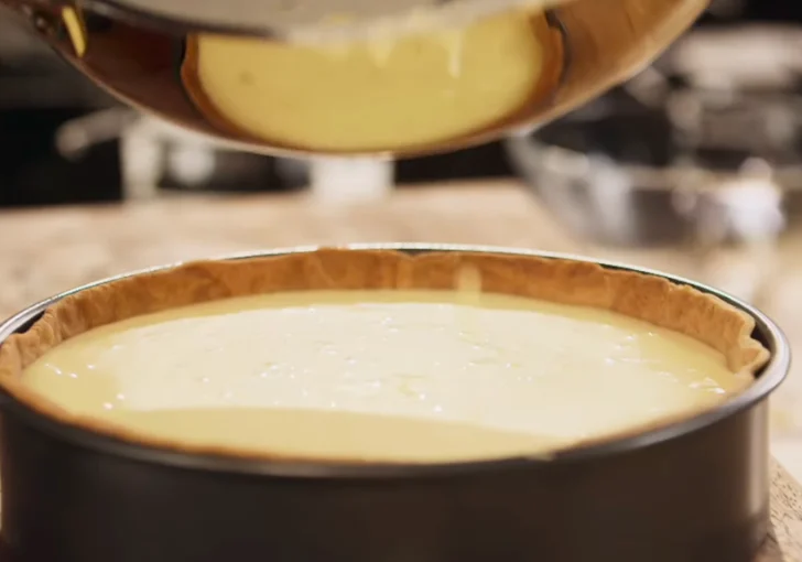 Pour the lemon posset mixture into the cooled pastry case, smoothing the surface if needed.